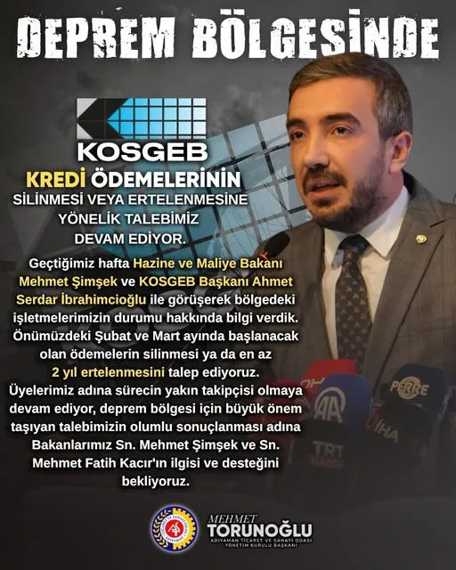 Deprem bölgesinde #KOSGEB kredi ödemelerinin silinmesi veya ertelenmesine yönelik talebimiz devam ediyor.